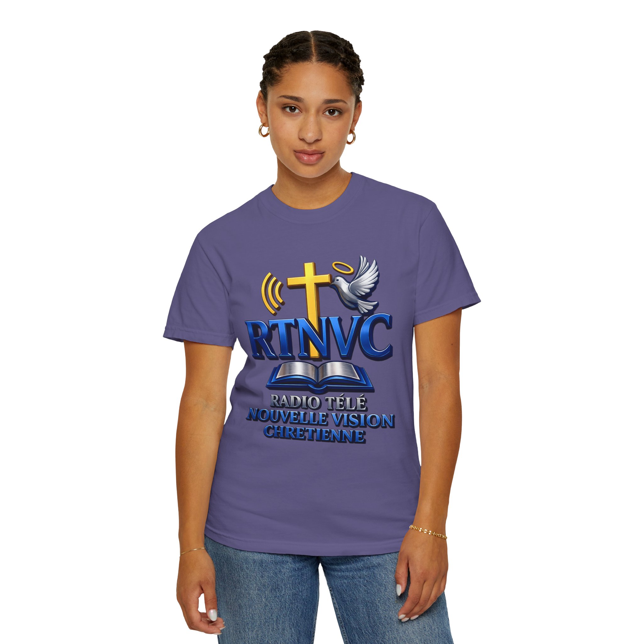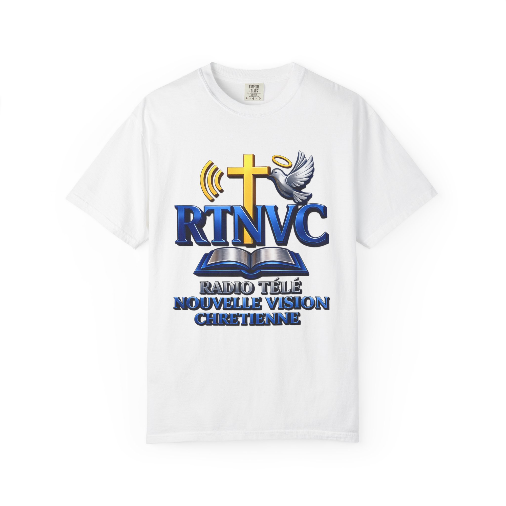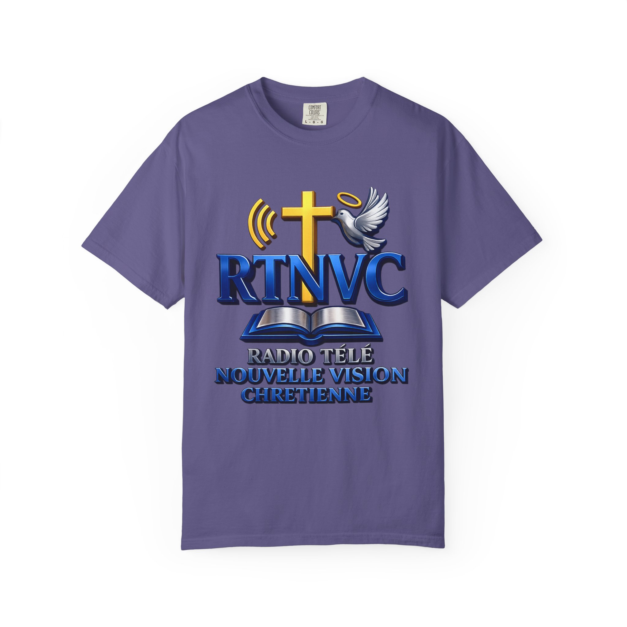 This heavyweight garment-dyed tee brings a lived-in softness to a bold, faith-centered design. The front art layers a golden cross, a dove in mid-flight, broadcast waves, and an open Bible beneath the letters RTNVC — a look that reads like a trusted radio ministry emblem. The shirt’s washed texture and relaxed fit make it feel familiar from the first wear, while the dense cotton holds the printed artwork with clarity. Wear it to rehearsals, community outreach, church events, or just around town to quietly share a message that matters.