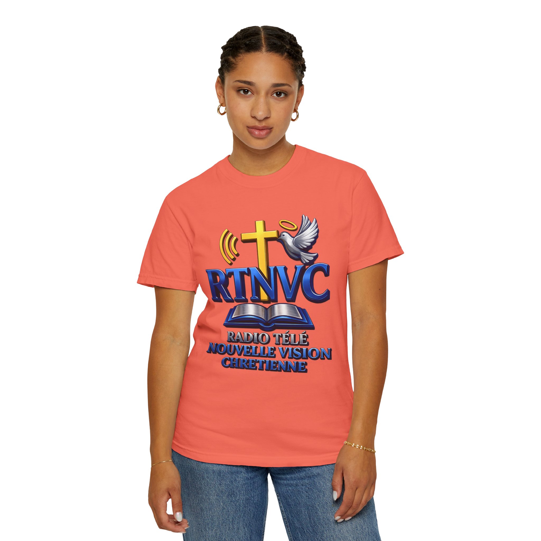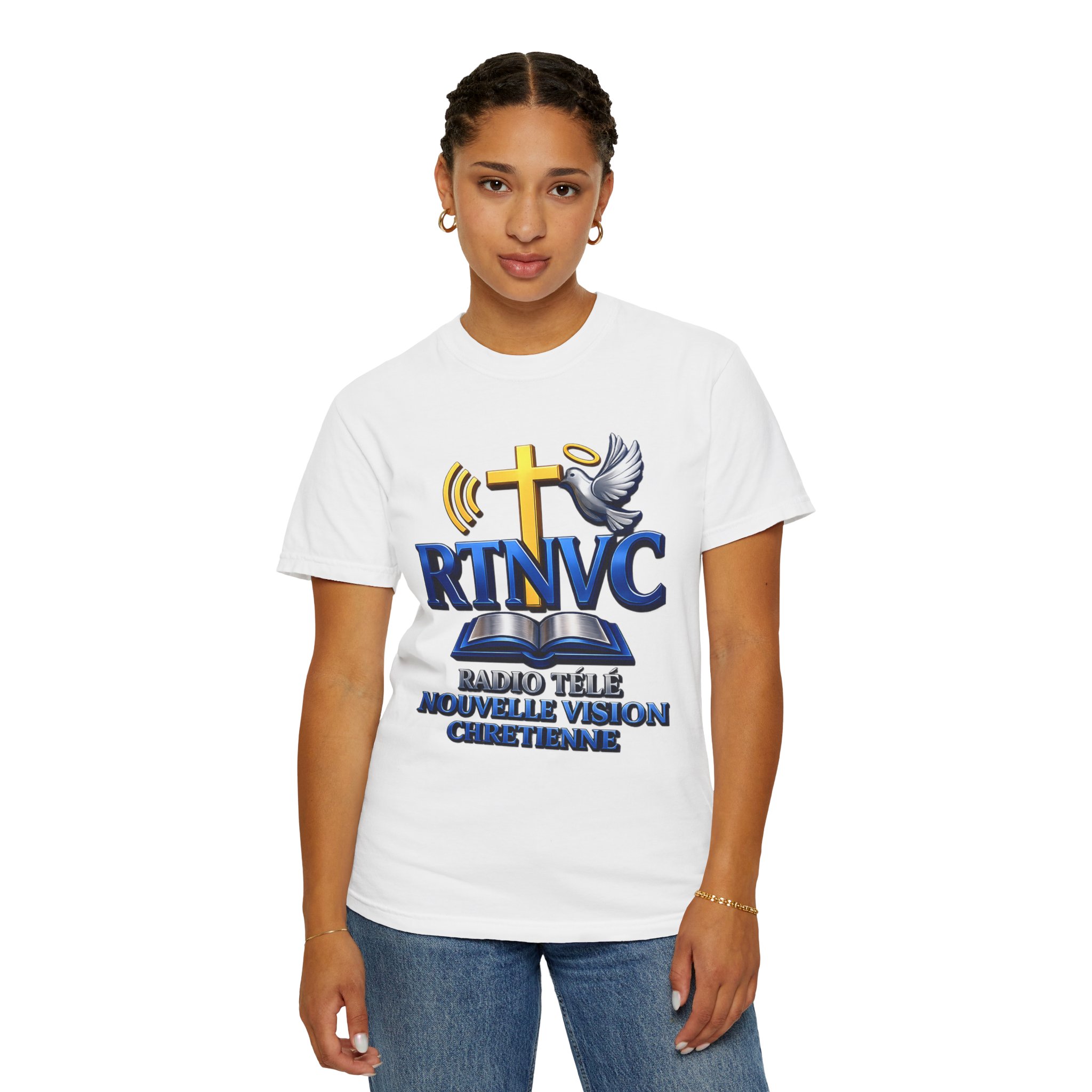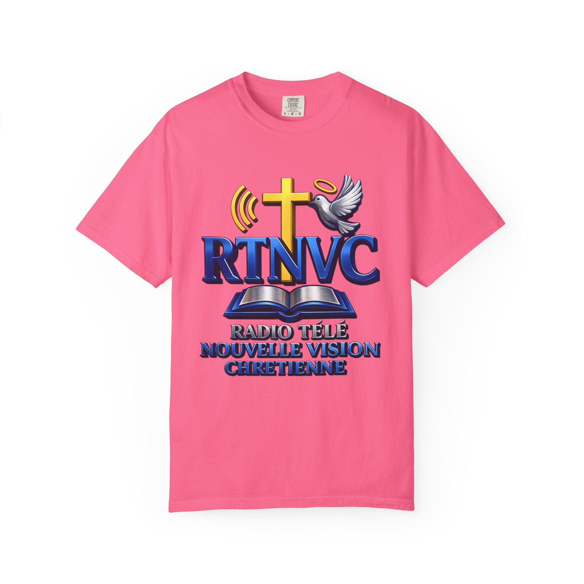This heavyweight garment-dyed tee brings a lived-in softness to a bold, faith-centered design. The front art layers a golden cross, a dove in mid-flight, broadcast waves, and an open Bible beneath the letters RTNVC — a look that reads like a trusted radio ministry emblem. The shirt’s washed texture and relaxed fit make it feel familiar from the first wear, while the dense cotton holds the printed artwork with clarity. Wear it to rehearsals, community outreach, church events, or just around town to quietly share a message that matters.